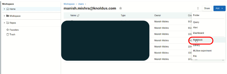 - Navigate to Workspace > user. Under user click on add and select the notebook option.