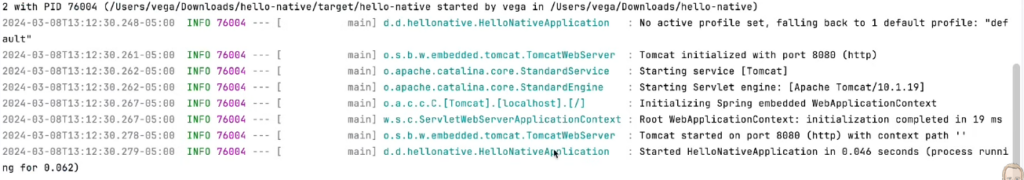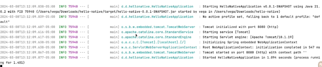 In our performance comparison, the Spring Boot JAR took approximately 1.094 seconds to start, whereas the native executable achieved a significantly faster startup time of 0.046 seconds. This 96% reduction in startup time, although observed in a small-scale application, underscores the potential of native images for reducing latency and improving responsiveness, especially in environments requiring rapid deployments or handling micro services where frequent restarts are common. For larger applications, this performance enhancement can lead to substantial improvements in deployment efficiency and system scalability.