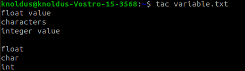 8. tac: tac is the opposite of a cat and works the same. H. Instead of printing lines 1 through n, print lines n through line 1. This is the opposite of the cat command.