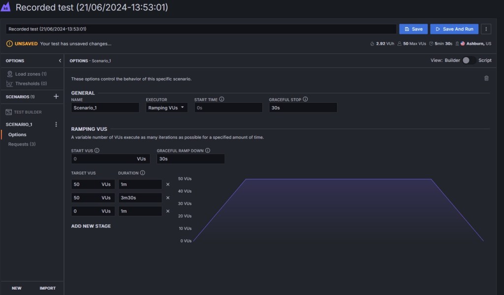 Grafana Cloud k6 provides many options to simulate realistic load. You can modify the same test so that the volume of traffic “ramps up”, which means it increases the number of active virtual users, and comes from multiple load zones, which are locations around the world.