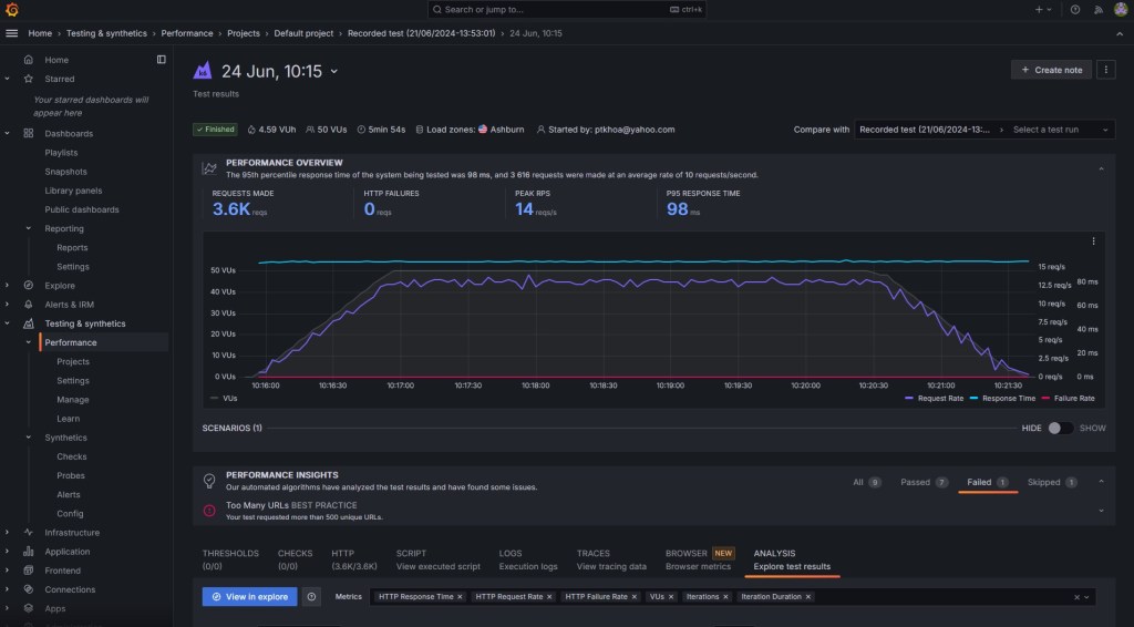 Notes: We can run that HAR file on K6 Cloud, but this test runs with one virtual user and one iteration by default. If we want to run with many virtual users, we have to convert HAR file to K6 by a third-party tool or we can edit that HAR file in K6 Cloud.