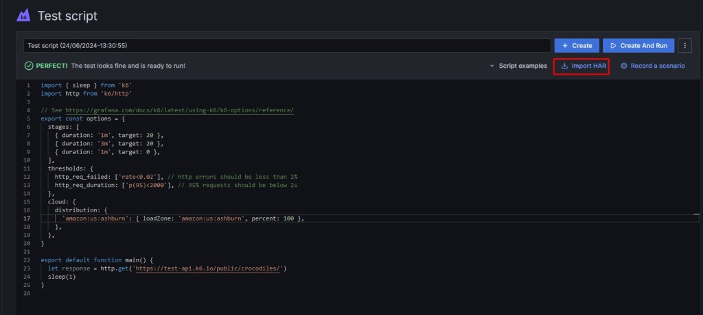 This command auto-generates a k6 script for you. It reads the HAR file (yourfile.har) and converts it into a k6 test (yourfile.js).