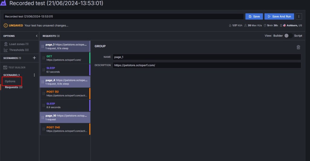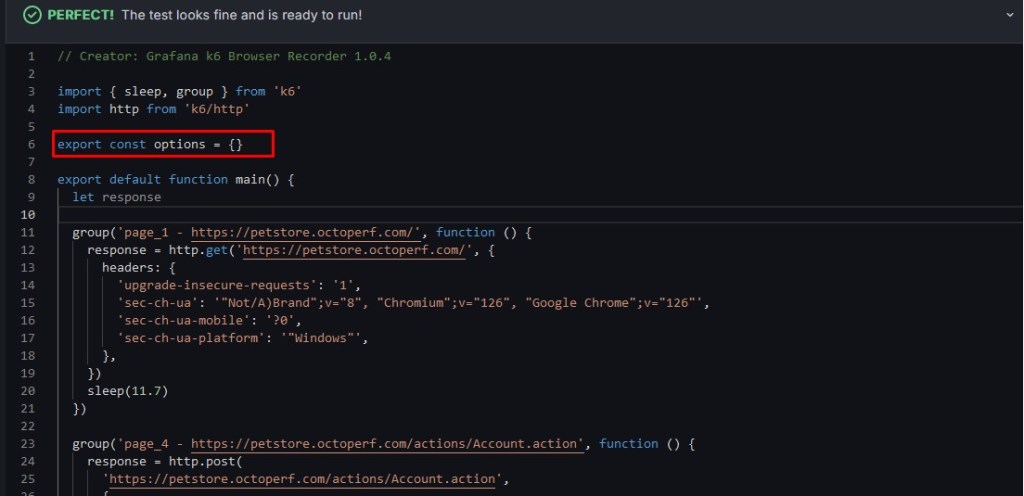 If we create and run that script, this test runs with one virtual user and for one iteration so we will edit the “export const options” in script as below: