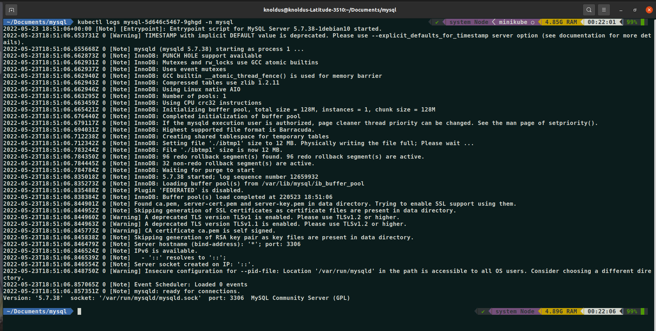 kubectl logs mysql-5d646c5467-9ghgd -n mysql