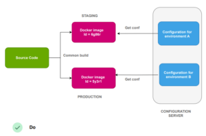 The solution to this problem is straightforward: create “generic” container images that are agnostic to the environment they operate in. For configuration, leverage external methods such as Kubernetes configmaps, HashiCorp Consul, Apache Zookeeper, etc.