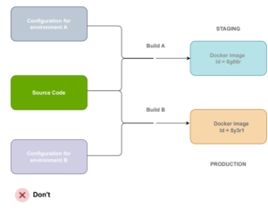This implies that for each distinct environment, you must rebuild your image, resulting in deploying something different to production than what was tested previously.