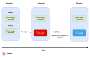 The “latest” tag becomes even more perilous when paired with an “always pull” policy. Consider this scenario: your pod has failed, prompting Kubernetes to initiate a restart to restore its health—after all, this is precisely why you’ve adopted Kubernetes in the first place.