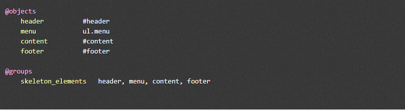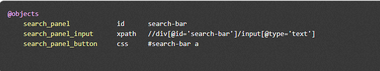 Each Galen spec file normally starts with an object definition. It is the place where you give names to page objects and also define the so-called locators – the way for Galen to find elements on the test page. The available locators are ID, CSS, and XPATH.
