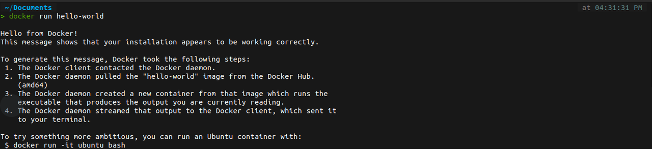 Now, I am running a hello world image using docker:-