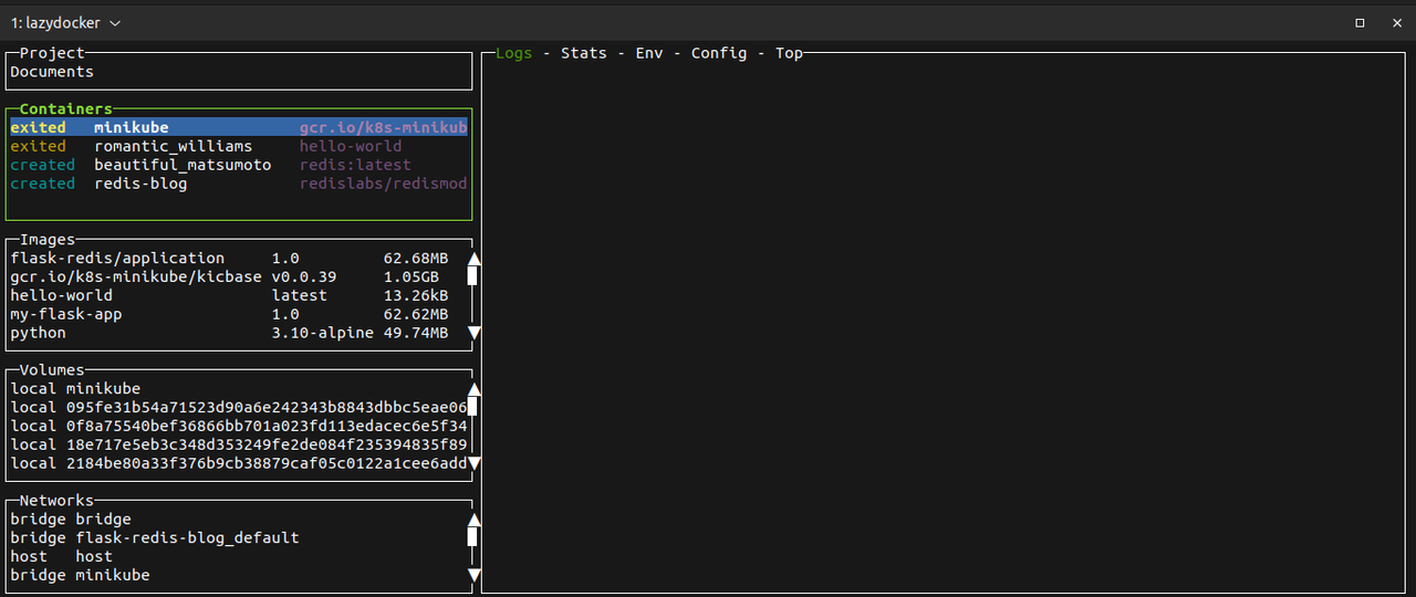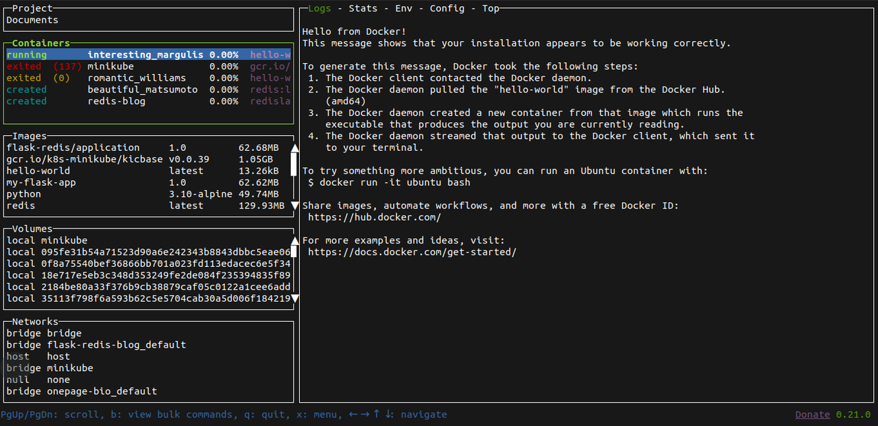 LazyDocker provides an interactive terminal interface that displays all your containers, images, volumes, and networks in an organized manner. You can use the UI to navigate to the other images, containers, and logs. It makes monitoring easy.