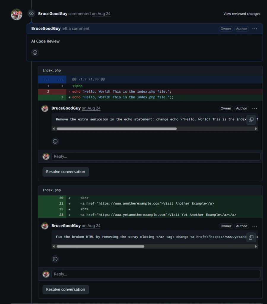 When this runs successfully, GitHub adds a shiny “AI Code Review” section to your Pull Request, filled with the model’s feedback
