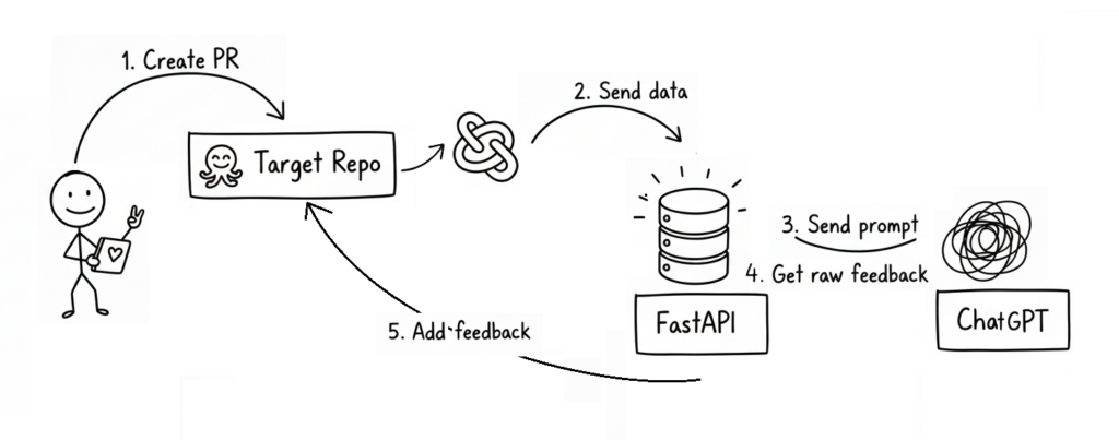 Think of it this way: normally, if you’re too lazy to review a pull request, you might just dump all the changes into ChatGPT, copy its feedback, and paste comments back. What we’re doing here is automating that entire loop. In other words, our app is essentially a GPT wrapper with some webhook and API magic sprinkled on top.