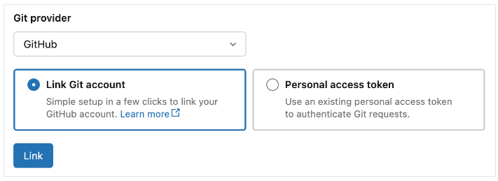 - Change your provider to GitHub, select Link Git account, and click Link, as shown in the below snap:
