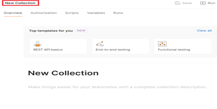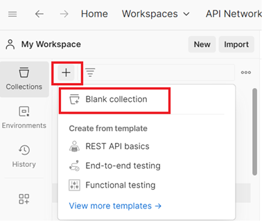 To create a collection, click + button, Blank collection. Then change name of ‘Blank collection’ to your specific collection such as “API Collection”