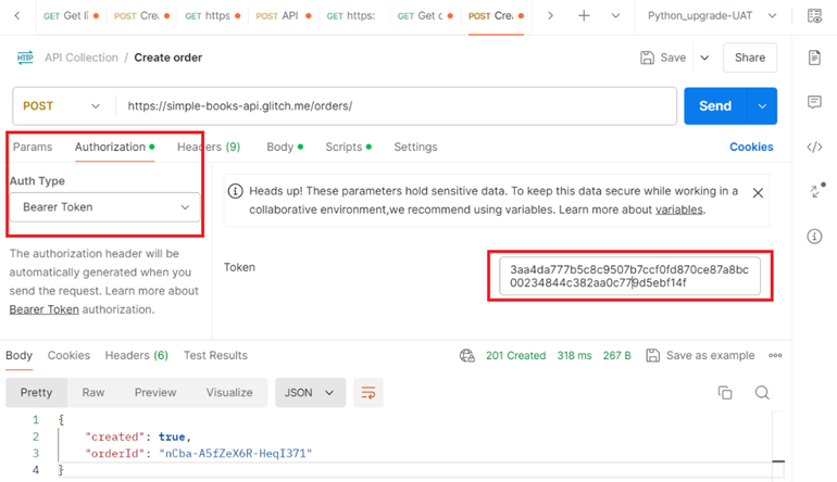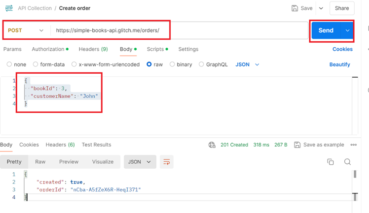 3.3. Send a POST request to create an order to borrow a book with required access token for authorization