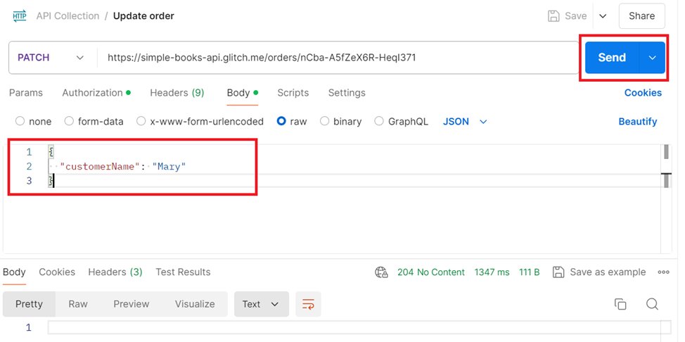 Click “Send,” and you should see updating order in the response section