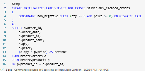 - SQL‑only authoring: You define MLVs with Spark SQL today. Declarative PySpark isn’t there yet.
