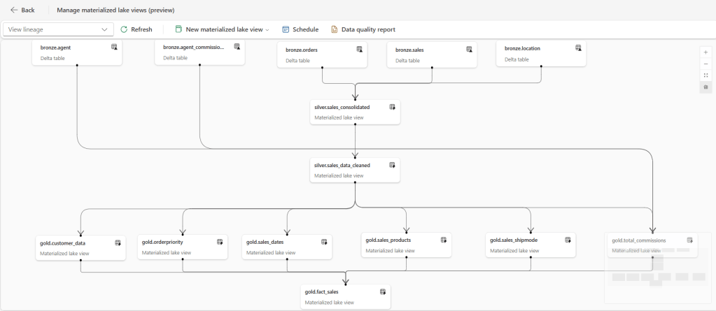 After successfully creating the MLVs in the Lakehouse, open Manage Materialized Lake Views to view the lineage and schedule a refresh cadence (e.g., hourly, nightly).
