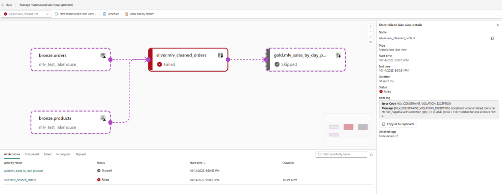 silver.mlv_cleaned_orders) fails on refresh, and the downstream Gold MLV is skipped automatically.