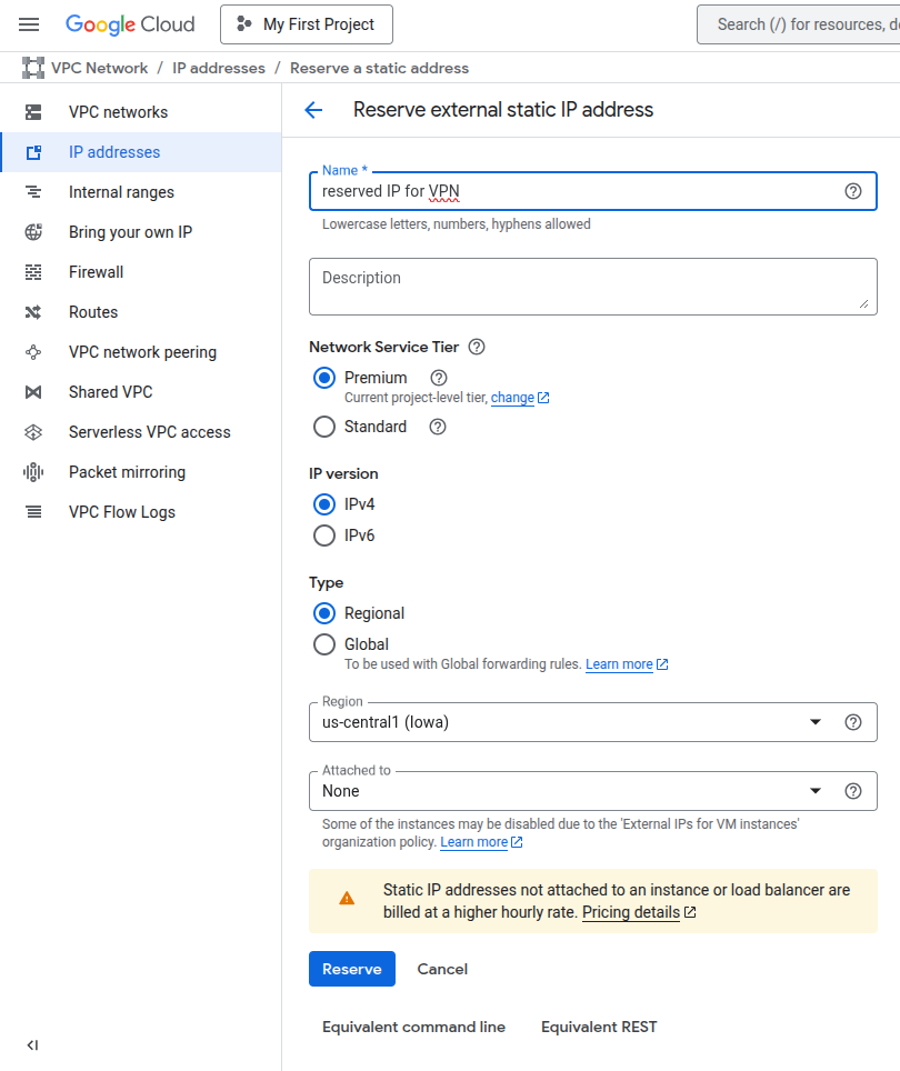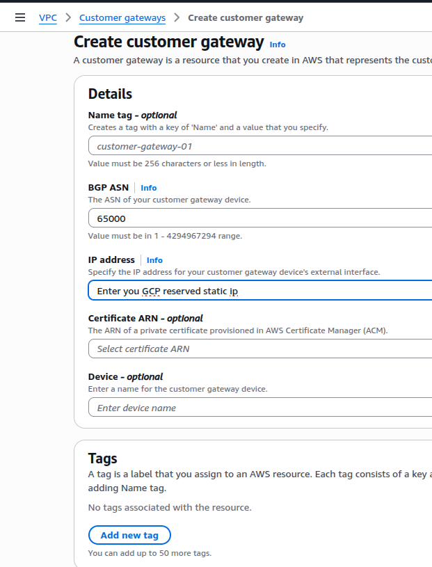 1. In GCP, reserve a external static IP address and create a customer gateway in AWS with the same IP Address