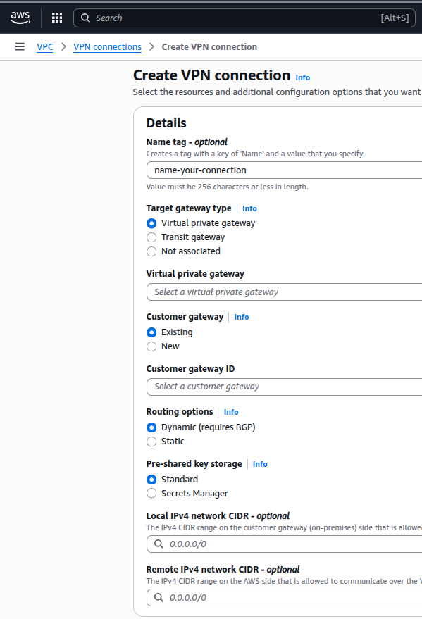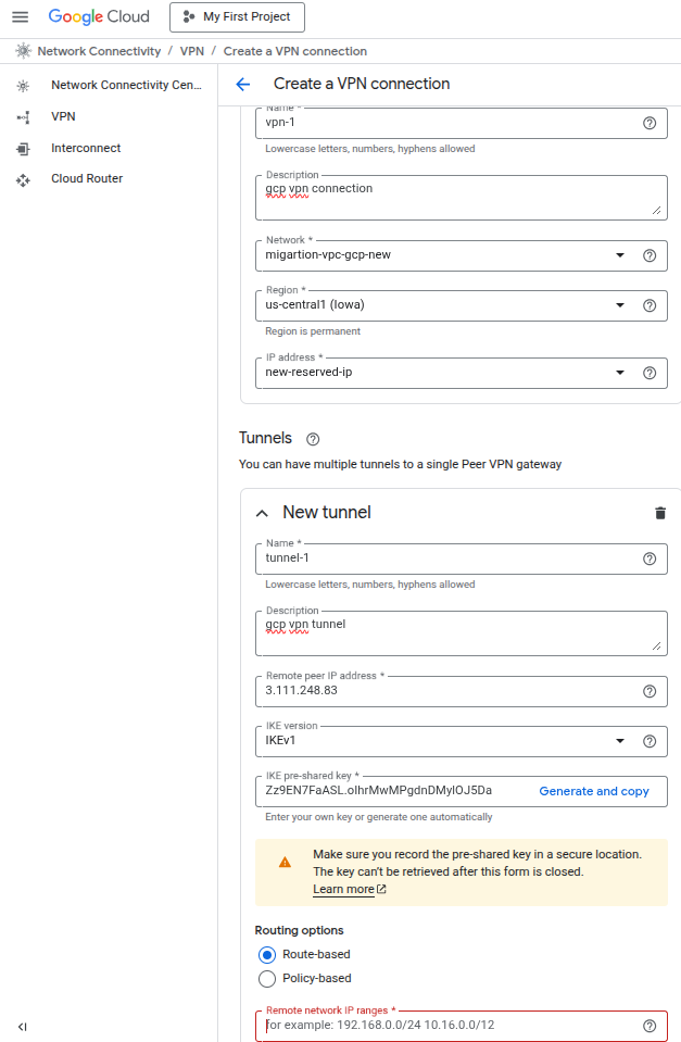 In Local IPv4 network CIDR – Put your AWS VPC CIDR Range and In Remote IPv4 network CIDR – Put your GCP CIDR Range.