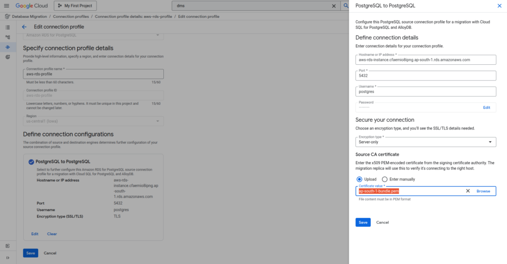 1. Create a connection profile for the source database (Amazon RDS for PostgreSQL) using the AWS RDS endpoint and credentials.