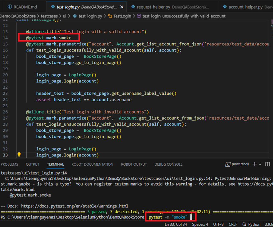 In the real project, we will define many test suites like regression test, smoke test or a specific suite for a feature. Therefore, our automation framework should support us in organizing the test suites and running the necessary test case only to reduce time for test execution. With various kinds of test runners, they can help us filter test cases by tag, annotation, attribute or title. Here is the picture for filter test cases with Pytest.