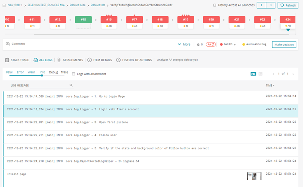 After running tests, our test automation framework should generate a test report automatically. The report should show detailed information of the test runs like the number of passed/failed/skipped test cases. For the failed test case, we should add the screenshot to the report. A good report can show us the history and statistics of the test cases. Currently, there are a lot of report tools we can leverage like Extent, Allure, Report Portal.