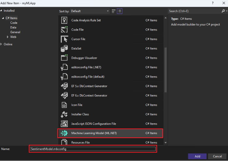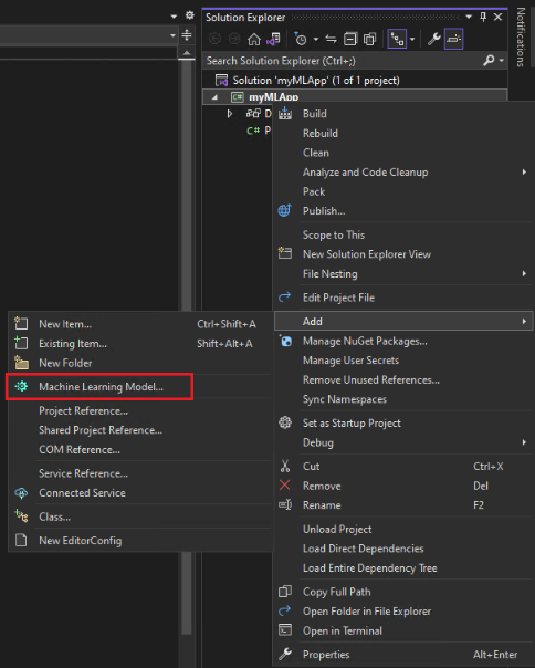 myMLAppproject in Solution Explorer and select Add > Machine Learning Model.