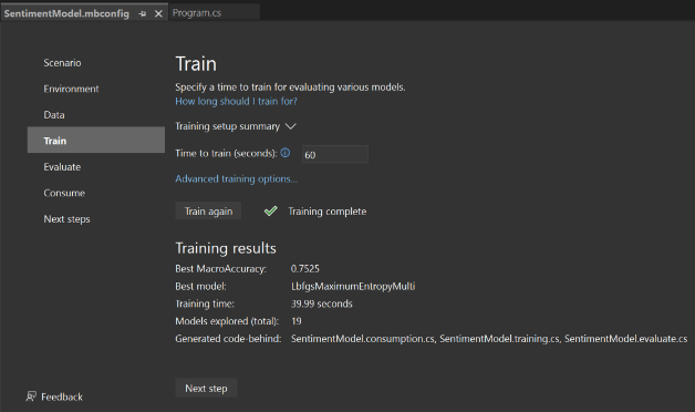- Change the Time to train, which is the amount of time you’d like Model Builder to explore various models, to 60 seconds (increase this number if no models are found after training).
