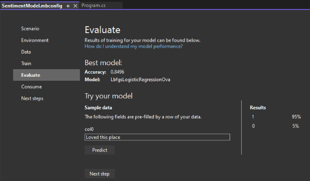 The file which you created now is a JSON file that keeps track of UI state and it will be added to your solution. A new window of Model Builder would pop up that will guide you for building a machine learning model.