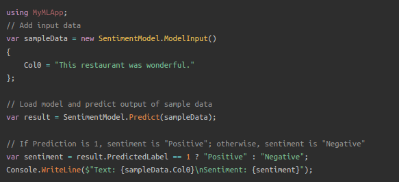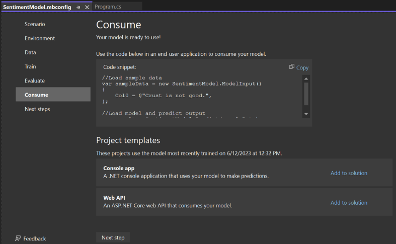 Here, a code snippet is provided which creates sample input for the model and uses the model to make a prediction on that input. There are two project templates (a console app and a web API), both which consume the trained model. Project templates are also provided that we can optionally add to the solution, in this case, Console and Web API projects.
