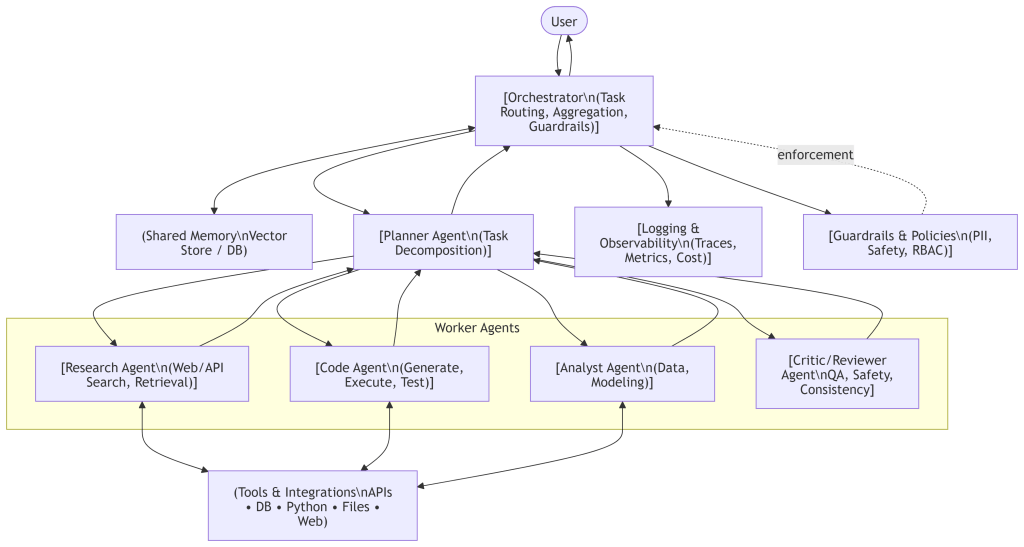- Memory: Shared and/or per‑agent stores for context, decisions, artifacts, and tool outputs.