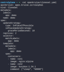 Lets start by creating a CloneSet yaml which will manage two replicas of pod with 2 containers in each. Container1 will be of nginx and container2 will be of busybox.