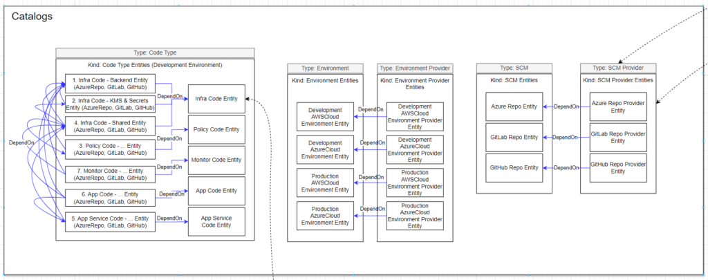 Because all code types above need to compile, build, and deploy into different environments we need to model it as well. In this step, we assume that the customer has 2 environments: development and production (in reality, there are Dev, QC, UAT, Staging, and Production, but luckily IDP is different in each project, and each customer so that we can customize and add as what we want). And we assume that we will deploy into Azure or AWS cloud platforms.