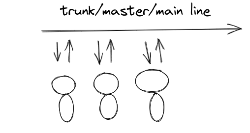 The easiest strategy by far is trunk based development. We have single branch you know the main line or trunk or master etc. And everybody is cloning that branch making some changes locally and pushing directly to the main line no branches, no pull request, no other things just working on features or bug fixes and as soon they are done pushing them back to the main line i.e the easiest branching strategy. There is nothing to do nobody needs to merge anything, nobody needs to maintain anything. We just push directly to the main line.