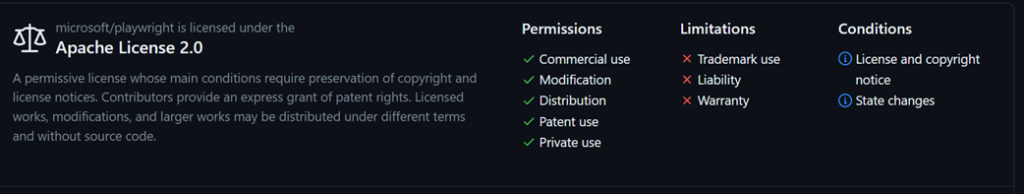 - Open Source: Playwright comes with Apache 2.0 License, so all the features are free for commercial use and free to modify.