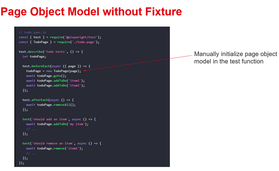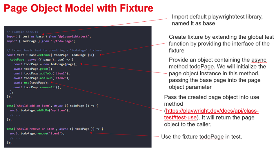 - Fixture (Playwright Test): Playwright Test takes the idea of POM further by introducing the test fixture. Fixtures are used to establish the environment, the page object, and the shared object for each test in isolation. We can define our shared objects’ instantiation logic into one fixture to use them later in any test cases. Hence, we don’t have to put more boiler-plate setup, and teardown code in every test file.