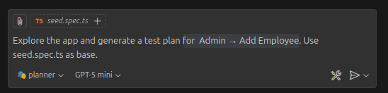 - A clear prompt, Example: “Explore the app and generate a test plan for Admin → Add Employee. Use seed.spec.ts as a base.”