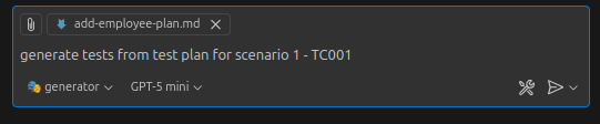 )specs/add-employee-plan.md - A clear prompt, for example: “Generate tests from the test plan for scenario 1 – TC001.”