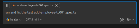 - A clear prompt, for example: “Run and fix the test add-employee-tc001.spec.ts.”