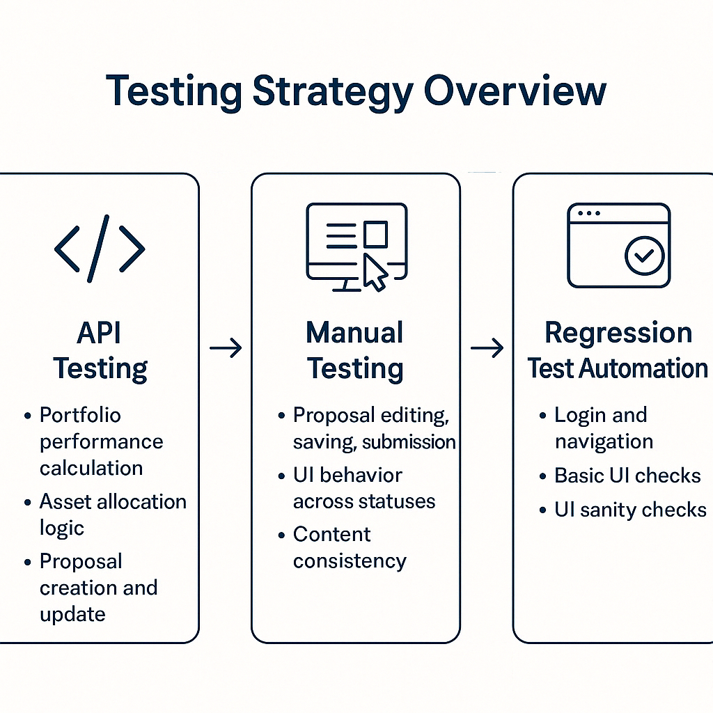 These platforms allow relationship managers to create proposals, share investment insights, and collect client feedback through digital channels. However, to ensure both functional accuracy and user experience, a well-defined testing strategy is critical.