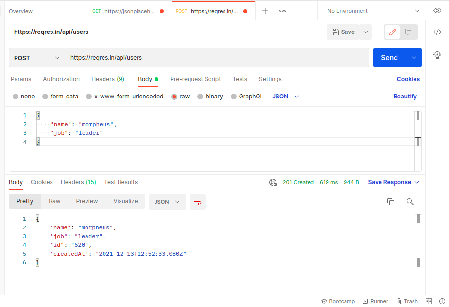 Below is the example of creating a user . here URL :- https://reqres.in/api/users