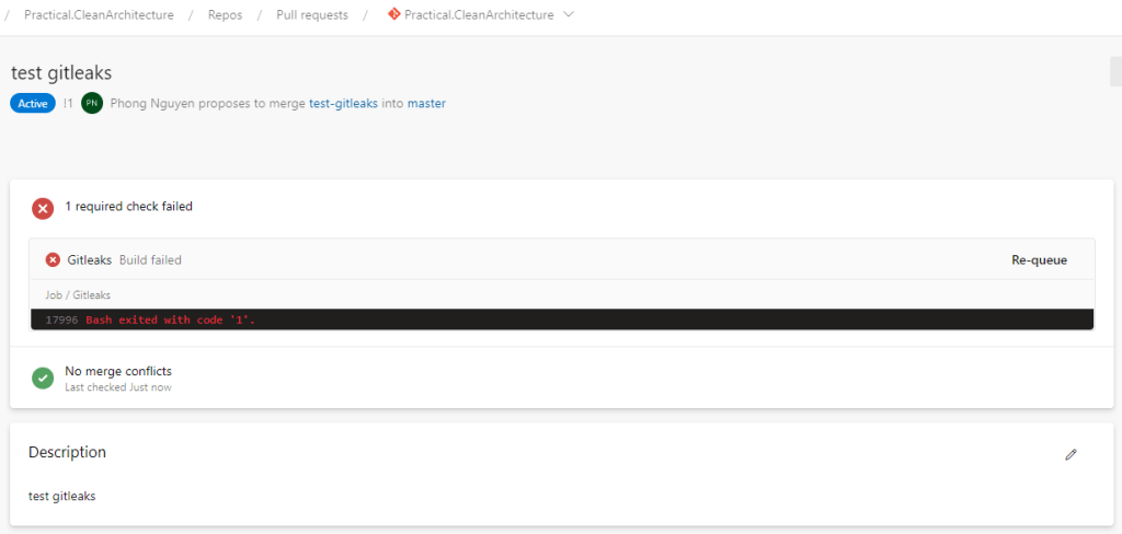 Commit the changes and check the pull request again, wait for the Gitleaks validation build to finish and you should see the pull request now is ready to be completed.