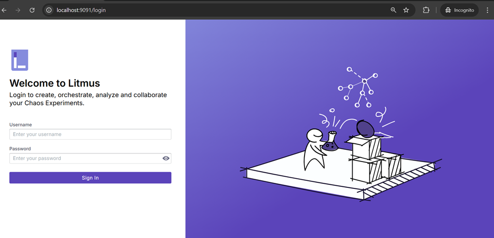 kubectl port-forward svc/litmuschaos-frontend-service -n litmus 9091:9091&
