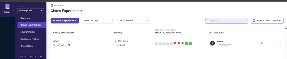 After inputting the Chaos Experiments name, we can select the chaos infrastructure which created in above section.