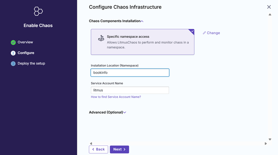 Then we can input the chaos name and configure the chaos infrastructure.