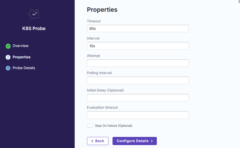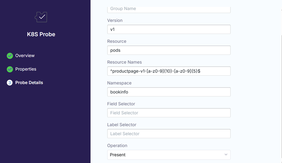 In this example, we’d like to check that after deleting the productpage pod, it will be re-created automatically. Therefore, we’ll choose Kubernetes probe with the following configuration.