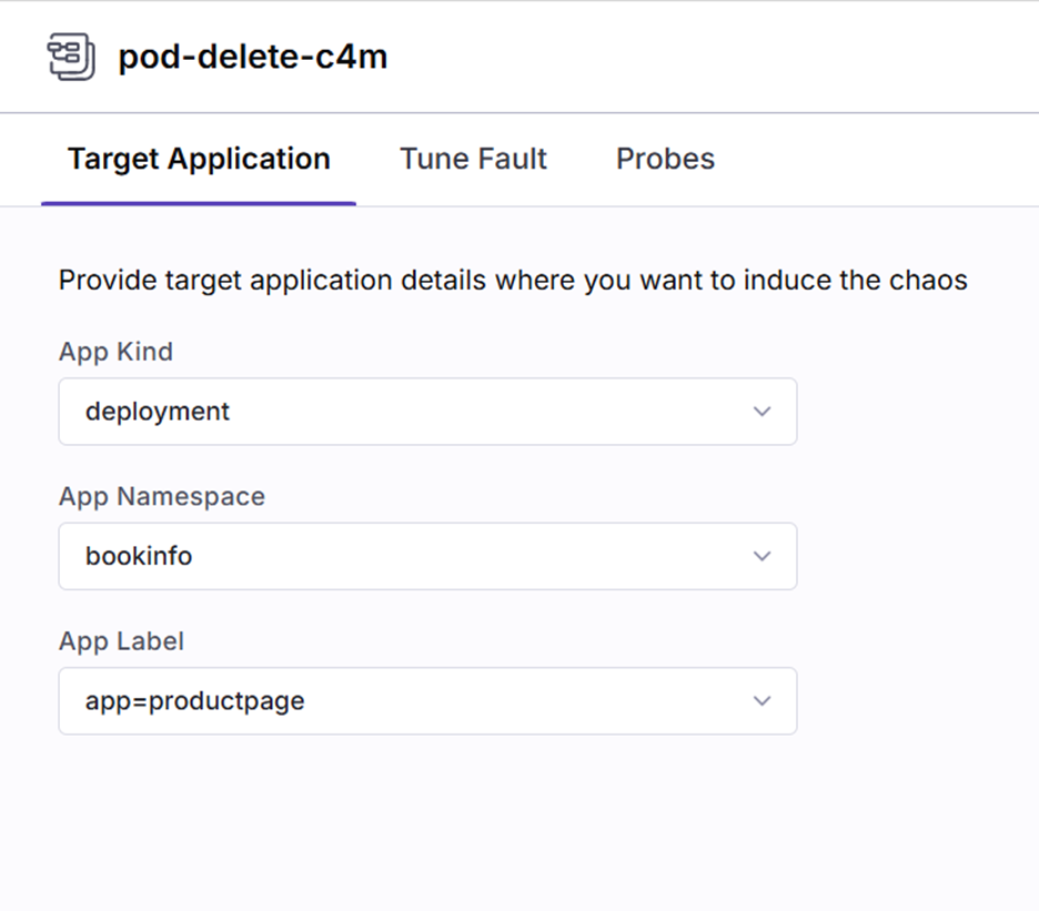 Add the fault configuration as below to delete the productpage pod in bookinfo namespace.