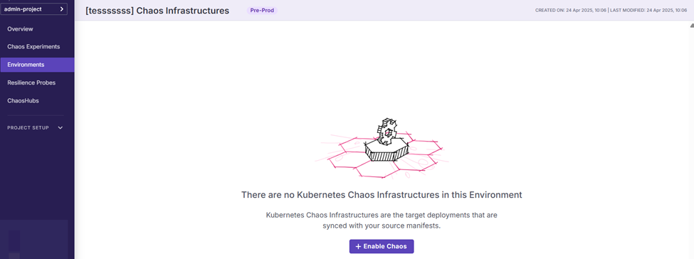 The next step is enabling Chaos, which will help us create the Kubernetes resources which are used for executing the chaos experiments. From the portal, selecting the target environment and click on the Enable Chaos button.